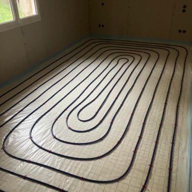 Pour le chauffage, un plancher chauffant a été installé dans toute la maison. Cette solution invisible et silencieuse assure une répartition homogène de la chaleur, idéale pour le confort hivernal. Associé à une pompe à chaleur performante, ce système permet également une réduction significative de la consommation énergétique.